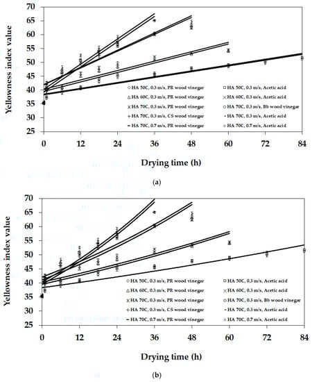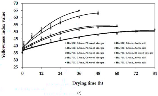 Figure 7 presents the YI kinetics of the NR sheet change during the drying process for each type of coagulating material, airspeed, and temperature. When the test started, the YI values of the experimental NR sheets and reference were between 35.1 and 35.7. Figure 7 presents that the increase in YI value related to the type of coagulating material and the increase in the airspeed and drying temperature.