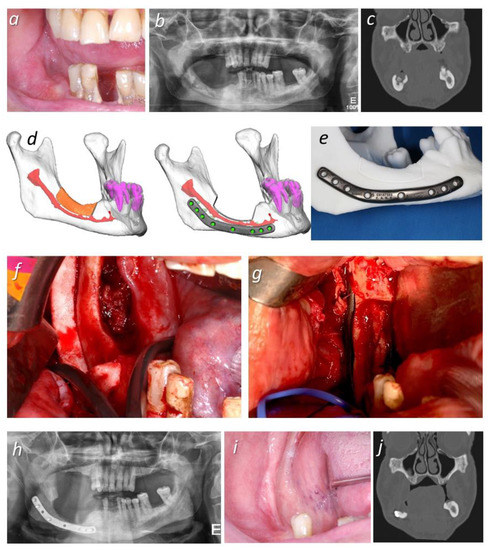 The patient remained asymptomatic and no signs of bone exposure, fistulae, or purulent discharge were observed up to the final follow-up of the present report at one year post-surgery (Figure 2h). The postoperative images indicated the correct placement of the reconstruction plate and signs of bone remodeling in the operated area (Figure 2i,j).