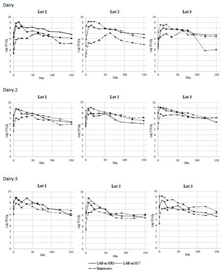 Although there were differences in the evolution among manufacturers and, for Dairy 1, among lots, enterococci reached high numbers during maturation in all cheeses and were still high in the products ready for consumption, being in the range of 5–7 Log CFU/mL. LAB showed similar evolution trends among lots and dairies, except for Lot 3 of Dairy 1, where LAB grown on M17 medium declined drastically after day 91.