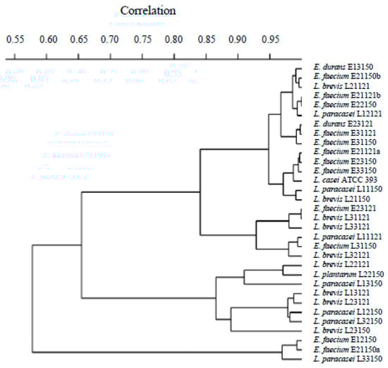 Correlation clustering based on average values of tolerance to low pH and bile salts and adhesion capacity reported in Table 2 for LAB isolates at 121 and 150 days.