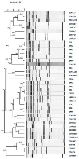 - Rasschaert, G.; Houf, K.; Imberechts, H.; Grijspeerdt, K.; De Zutter, L.; Heyndrickx, M. Comparison of five repetitive-sequence-based PCR typing methods for molecular discrimination of Salmonella enterica isolates. J. Clin. Microbiol. 2005, 43, 3615–3623. [Google Scholar] [CrossRef][Green Version]