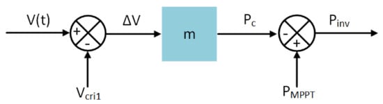 where P M P P T is maximum PV power output for a particular solar irradiance (kW), m is represented as droop coefficient (kW/V), and V ( t ) is measured voltage at point of connection (POC) of the PV with the LV feeder at time t. When the voltage at POC, V ( t ) operates in normal limits (Range A), i.e., V ( t ) < V c r i 1 , at that time the total PV generation is injected into the LV network, i.e., P i n v = P M P P T . When V ( t ) operates beyond the normal limits, i.e., V ( t ) > V c r i 1 , then PV power injected to LV feeder is reduced by a droop factor based on (1). During this condition, the power curtailment P c is calculated using