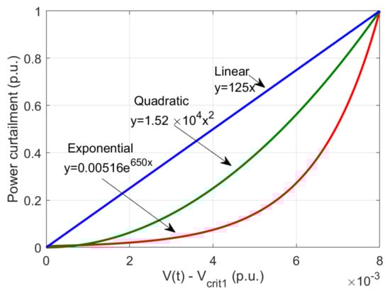 The droop coefficient obtained from (1) is a constant value, and the power curtailment occurs in a linear fashion with the droop coefficient as the slope of the function, as shown in Figure 2. As the voltage at POC exceeds V c r i 1 (1.050 p.u.), the droop-based APC begins to curtail PV power injection, until the voltage reaches V c r i 2 (1.058 p.u.), where maximum curtailment occurs. The same logic can be summarized using values in per unit form. When the voltage difference at the POC ( Δ V ) is 0, there is no power curtailment. Similarly, when the voltage difference at the POC ( Δ V ) is 0.008 p.u., the power curtailment is 1 p.u. Similarly, a set of Δ V and power curtailment values were created and used to obtain different functions by analytically solving the quadratic and exponential functions to have minimum and maximum curtailment at V c r i 1 and V c r i 2 , respectively. The quadratic droop and exponential droop function are given by (3) and (4), respectively.