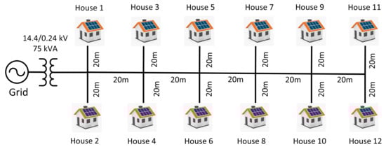 The system model of a residential suburban LV distribution feeder given in [21], shown in Figure 5, was used in this work. The system consists of twelve houses with residential PV installations in each house. The feeder has a single-phase 75 kVA, 14.4/0.24 kV distribution transformer with split-phase supply at the secondary side that connects to the grid. The network has a 100 m long feeder line with each house connected by a 20 m long feeder line. Each house is capable of generating 5 k W p of electrical energy from PV, and the annual generation from these houses is ~14,892 kWh. Table A1 lists the LV transformer parameters, and Table A2 lists the parameters for single phase PI section line. The PV inverter, and the house load models are both modeled as voltage dependent current sources to depict the instantaneous power flow from and to the houses, and PVs.