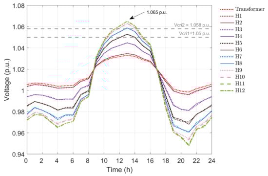 For the base case, the model was simulated without any inverter control where the PV inverters inject full maximum power point power until the voltage at POC reaches 1.10 p.u., after which the system shuts down if the voltage exceeds 1.10 p.u. Figure 7 shows the voltage for the base case simulation, without any droop control. The voltage profile for houses at the same POC of the LV distribution network are the same and equal in values. The maximum voltage of 1.065 p.u. occurred at 1 pm in houses 11 and 12, that was above V c r i 2 . Similarly, houses 7 to 12 undergo overvoltages, that is, the voltage exceeds V c r i 2 , during the 24 h simulation time period. The energy output from PV was computed by determining area under the power curve. The energy output from the PV inverters from all the houses summed up to be 489.60 kWh for the 24 h period.