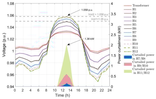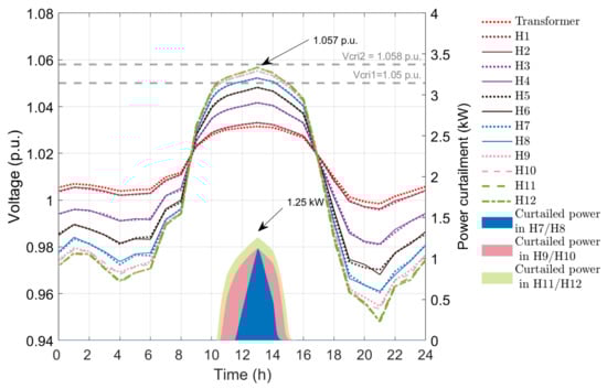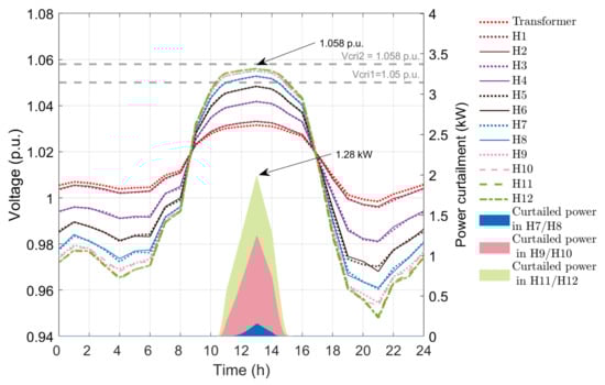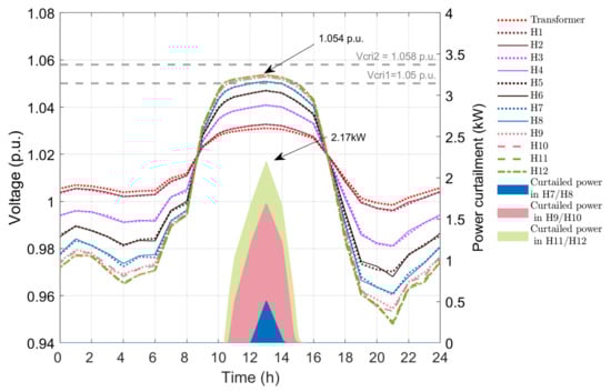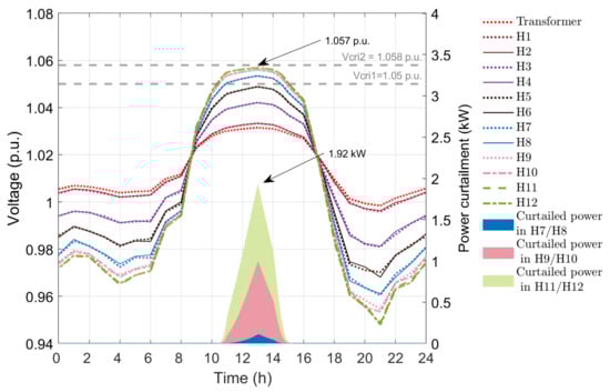 This case has droop-based controllers in PV inverters driven by an exponential droop function. Figure 10 presents the voltage profile of the twelve houses and power curtailment after using APC method using the exponential function. The maximum voltage at houses 9 to 12 is 1.057 p.u., which is less than V c r i 2 . Houses 9 to 12 do not experience overvoltage at any time during the 24 h period. The maximum power curtailment is 1.92 kW for houses 11 and 12, which is slightly less than that in APC method with quadratic droop. The curtailments from house 7 to 12 are the lowest in this method compared to above droop-based APC techniques as the function has the lowest curtailment for the same voltage difference among the three techniques. The energy loss in APC method with exponential droop is 12.40 kWh.