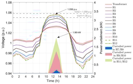 After applying droop-based APC control, the maximum voltage at houses 11 and 12 is reduced to 1.054 p.u. from 1.065 p.u of base case as shown in Figure 8, which is less than V c r i 2 . Similarly, none of the houses exceed the voltage limit of V c r i 2 . Figure 8 also shows the power curtailed during APC implementation with linear droop. The maximum power curtailed at 1 pm was 2.17 kW. However, due to the power curtailment, the total energy output from PV reduced from 489.60 kWh in the base case to 466.87 kWh with the linear droop-based APC. The total energy loss due to curtailment was 22.72 kWh.