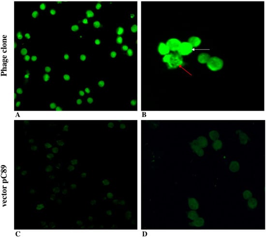 Phage clones were found to specifically bind the MM cells line, as seen by the bright green fluorescence of FITC (Figure 1A,B) compared with the absence of fluorescence when the pC89 vector insert-less was used (Figure 1C,D). These findings indicate that the binding specificity was due to the foreign peptides displayed by phage clones, and the amine-reactive fluorochrome in the major coat protein, pVIII, did not modify the phage’s ability to bind the MM.1 target cells. However, we observed a different phage location, homogeneously distributed (white arrows in Figure 1B) or limited to specific subcellular sites (red arrows in Figure 1B) within the same cell population. These results could depend on the presence of different phenotypes originating within the same cell line. Although still controversial, the immunophenotype of the MM.1 cell line shows CD38+/45−, with the presence of two subpopulations CD138++ (96%) and CD138low (4%) [,]. In addition, CD56 expression was decreased in the MM.1R cell line compared with the sensitive counterpart (MM.1S) [].