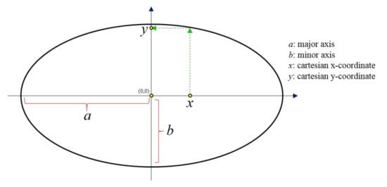 Schematic diagram showing an ellipse with major and minor axes, centered at the origin of the Cartesian coordinate system.