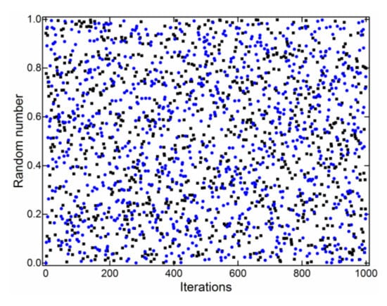 Graphical comparison between random numbers generated using our model (black squares) and the FORTRAN90 compiler (blue circles) for 1000 iterations.