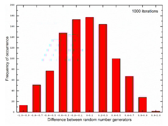 Figure 2 and Figure 3 show that the pseudo-random numbers generated from our model and the standard FORTRAN90 routine were similar. The peak of the distribution of differences lay in the bin with a range from 0 to 0.1. The mean of the differences was found to be −7.55 × 10−3, which was very close to zero.