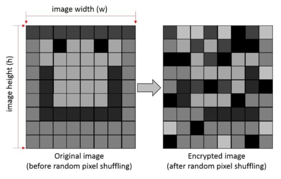 The positions of pixels in an image were randomly shuffled using the random number generator from our model. The width (w) and height (h) of the image were determined from the image file, which was in a greyscale pgm format at the current stage. The random pixel shuffling scheme is shown schematically in Figure 4.