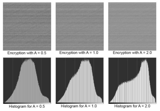 where P(i,j) was an array with the same size as the encrypted image pixel array and A was a user-defined variable that controlled the amplitude of the cosine function. The absolute value of the product of the cosine function with A was then multiplied by 255 (i.e., the largest pixel value in a greyscale image). In fact, as the present computer code is open-source, users can experiment with different functions and variables to obtain their desired level of encryption. We examined histograms of encrypted images for three different A values, as shown in Figure 6. It could be noticed that the histograms were no longer similar to the histogram of the original image shown in Figure 5. Therefore, the proposed pixel value shuffling method worked satisfactorily.