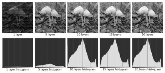 Evolution of image decryption with multi-layer merging. The associated histogram showing the distribution of greyscale values of pixels for each decrypted image is also shown. The x-axis in the histograms represents greyscale values ranging from 0 (black) to 255 (white).