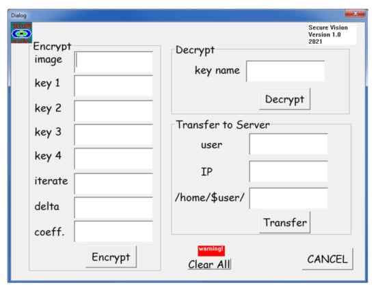 A graphical user interface (GUI) was developed for the present computer program, which facilitated users to encrypt, decrypt and transfer their images in a very efficient and easy-to-use manner. The GUI implementation of any software leads to a user-friendly working interface. The GUI can be broken down into three main sections, namely: (1) encryption, (2) decryption and (3) transfer to server. A screenshot of the developed GUI is shown in Figure 9.