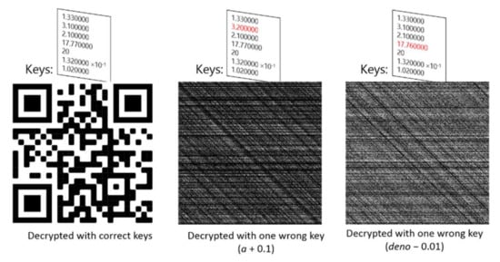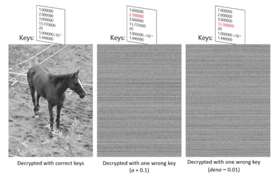 Decryption of encrypted image in Figure 10 using correct and wrong keys. The key values used for each decrypted image are shown above the image, with the wrong key value shown in red.