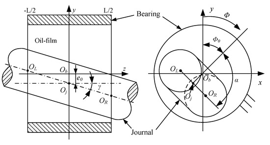 in which c stands for the clearance; e represents the eccentricity; and denotes the attitude angle, which is used to depict the angle between the direction of the static load and the eccentricity line at equilibrium position. When the misalignment effect is considered, Equation (2) is no longer appropriate for describing the thickness of the oil-film since the thickness in axial direction has changed. The thickness is then given by introducing two misaligned angles as [20,23,47,48,49]