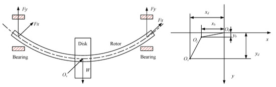 where m represents the mass of the rotor and disk; denotes the eccentricity of the unbalance mass; is the parameter used to describe the flexibility of the rotor; {} and {} represent the displacement components of the journal and disk center, respectively; and {} stands for the acceleration components of the disk center. In addition, combining with the linear bearing forces gives us [51]