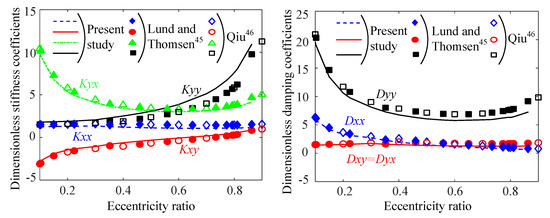 Using the present formulation, the static and dynamic characteristics of an HDB are calculated at a constant rotation speed of . To verify the present implementation, the results available from papers [45,46] are presented for comparison. The attitude angle and the Sommerfeld number S in terms of the eccentricity ratio are presented in Figure 4. The maximum pressures under various eccentricity ratios are listed in Table 3. These results show that the attitude angle and Sommerfeld number decrease as the eccentricity ratio increases, at a constant rotation speed, whereas the maximum pressure displays the opposite behavior.