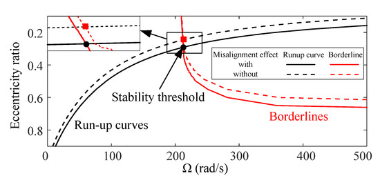 Next, the stability threshold is determined using the new implementation verified above. The parameters of the rotor-bearing system are adopted from Table 1. The misaligned angles are set as . Figure 6 shows the run-up curve and borderline calculated for both misaligned and aligned situations. These curves are used to determine the stability threshold of the rotor-bearing system. The run-up curves in both situations show that the eccentricity ratio decreases as the rotation speed increases. This implies that the journal center moves towards the bearing center (Figure 1) as the rotation speed increases.