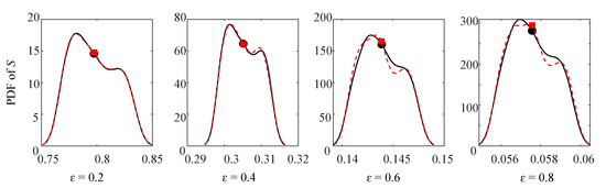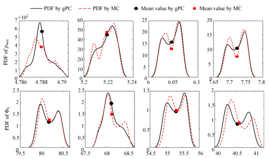 As the characteristics of HDB vary with the eccentricity ratio, the probability distribution and mean values of static characteristics at are evaluated by the gPC expansion, as shown in Figure 8. The results obtained by the MC simulation are plotted in the same graph. It is observed that the distributions vary with the eccentricity ratio. The values corresponding to the maximum probability for each variable differ from their mean values. Some results show a limited agreement with the MC simulation, such as the PDF of at and at . This phenomenon results from the numerical iteration [53]. For a random system with an analytic expression avoiding the iterative approach, the consistency will be better. Generally, the PDF and mean values obtained by gPC expansion display good accordance with those obtained by the MC simulation. This indicates that the constructed third-order gPC expansion is accurate enough to approximate the random outputs. Furthermore, it is clearly known that the number of collocation points required for gPC expansion is much smaller than the number of sampling points required for MC simulation of similar accuracy.