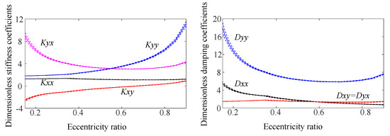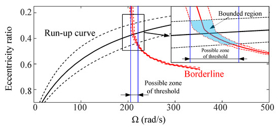 where stands for the natural frequency of the flexible shaft, () represent polynomials as shown in Appendix A, and () are functions of the dimensionless dynamic coefficients shown in Equation (13). Meanwhile, it is known from Section 2 that dynamic coefficients are functions of the eccentricity ratio . It is therefore possible to conclude that is a function of by combining with Equation (25). Using this approach, it is possible to determine the borderline.