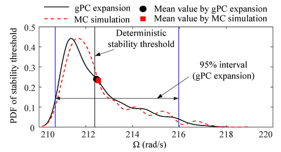The PDF, mean value, and 95% confidence interval of the stability threshold are evaluated using the gPC expansion, as presented in Figure 11. The PDF matches well with that of the MC simulation. The mean values of the stability threshold obtained by the gPC expansion and by MC simulation are and , respectively. These values are close to the deterministic result. However, the mean value of the stability threshold lies outside the maximum probability region. The 95% confidence interval of the stability threshold is from to , which means that the system should avoid this region during operation.