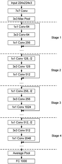 A smaller version of ResNet50 consists of four stages, as shown in Figure 3. It was initially trained to classify 1000 classes on the ImageNet dataset and has a fully connected layer with a size of 1000.