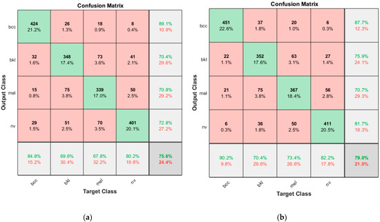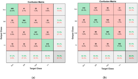 Next, the effects of the types of augmentation techniques on the accuracy of skin disease classification were evaluated using Model IV. With no augmentation techniques applied at all, the model yields a 0.7835 accuracy. When a random scale with a factor from 0.6 to 1.4 is applied, an average accuracy of 0.7785 is obtained. When a random rotation from 0 to 360 degrees is applied, the model shows 0.7620 accuracy. As for when random reflection in the left–right direction and top–bottom direction is applied, the accuracy is 0.7735. An accuracy of 0.7765 is obtained when applying random horizontal and vertical shear from 0 to 45 degrees. With all the above types of augmentation combined, the model gives a 0.7430 accuracy. The comparison of augmentation types is summarized in Table 2. It can be seen that the worst result of 0.7430 comes from using the augmentation techniques combined, using no augmentation techniques at all yields the best accuracy of 0.7835, and all other augmentation techniques used reduce the classification accuracy. The results suggest that for skin disease classification, using basic image manipulation techniques for data augmentation does not necessarily help in improving the classification performance of the networks and should be used cautiously. In Table 2, confusion matrices of Model IV without using data augmentation and using combined data augmentation are shown in Figure 6.