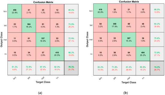 (a) Confusion matrix of Model IV using transfer learning; (b) confusion matrix of Model II trained from scratch.