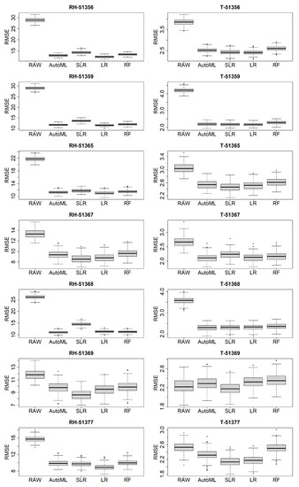 Moreover, compared to three other MOS methods, our ensembled AutoML model also had a better performance, as shown in Figure 8, Figure 9 and Figure 10. For example, RF, MLR, and moving error post-correction model, respectively, have larger RMSE values than the AutoML model, with a mean difference of 0.11, 0.07, and 0.09 °C for temperature and 0.55%, 0.61%, and 1.12% for relative humidity. Besides, compared to the SLR model, the AutoML model also showed a better performance than the MLR model, as exhibited in Figure 11. The post-correction improvement due to AutoML compared to SLR was −0.17 °C and −1.54% for T and RH RMSE values, respectively; this was more significant than the improvements of of 0.04 °C and −0.56% caused by MLR.