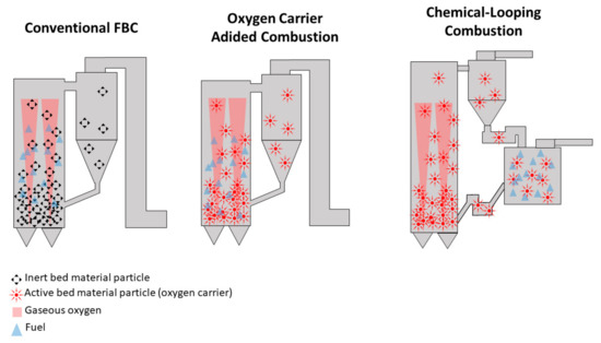 CLC has yet to be developed into a practically viable technology. Instead, this study focuses on the use of oxygen carriers in the context of a related, and more readily available spinoff technology: Oxygen carrier aided combustion (OCAC). OCAC is a technology in which oxygen carrier particles are used as bed material in FBC. The oxygen carrier is used instead of, or in combination with, conventional bed material. Utilizing oxygen carriers in FBC changes the reaction paths in the bed which can provide many advantages. Increased efficiency and reduced emissions of CO and NO have been demonstrated. A discussion of the technology and practical aspects will be presented below. OCAC can be implemented in existing boilers with more or less no adaptation of the equipment, which was concluded in [31]. Further motivation for developing OCAC is that, even though it doesn’t have the advantage of inherent CO2-separation that CLC possesses, it could become a bridging technology between current conventional, large-scale biomass combustion and future facilities for CO2-capture. Essentially, commercial deployment of OCAC contributes to creating experience with and acceptance for using oxygen carriers in combustion applications. The development from FBC to OCAC and finally to CLC is illustrated schematically in Figure 2. The figure shows that the development from FBC to OCAC requires few changes and results in better oxygen availability throughout the boiler and takes advantage of oxygen carrier—fuel interactions. Further development to CLC requires more significant changes in the equipment and relies solely on oxygen carrier—fuel interactions.