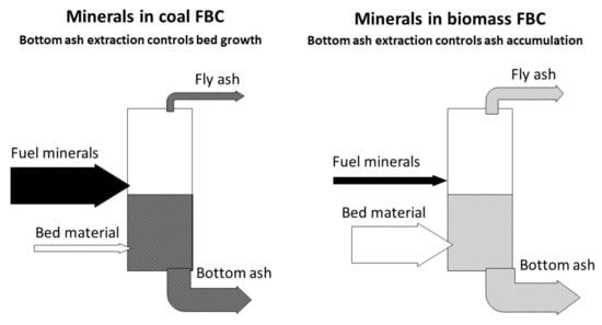Schematic representation of the mineral balance over coal and biomass-fired FBC boilers.
