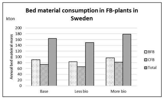 The results from the calculations are presented in Figure 4, showing an estimated total of 160–180 kton of silica sand being consumed yearly as bed material in Sweden. Completely replacing the bed inventory a few times a year (for example during planned shut-downs) is contributing to the total amount of sand consumption by around 1–2%. CFB and BFB sand can be assumed to originate from the same sources, but their properties differ when it comes to particle size distribution. CFB and BFB sand are in the approximate size ranges 0.2–0.4 and 0.8–1.2 mm, respectively. These fractions are obtained by sieving natural sand.