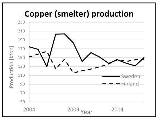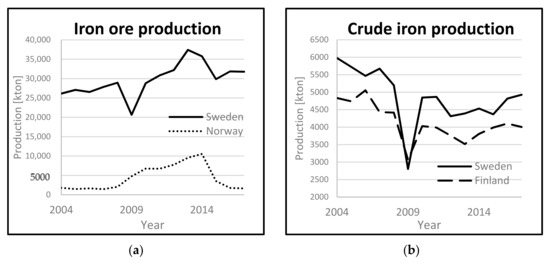 The iron ore- and steel industry is one of Sweden’s largest industries. In 2019, the total amount of ore mined in Sweden was 47.5 Mton, being refined into 27.3 Mton ore-products [70]. A smaller amount of iron ore is also mined in Norway, where the amount has varied a lot historically due to the closing and reopening of mines [71]. Ore-production quantities for Sweden and Norway between 2004 and 2017 are presented in Figure 5a. Steel production in Sweden amounts to approximately 4.5–5 Mton crude steel, including both ore-based and scrap-based steel production. A similar amount of crude steel is produced in Finland.