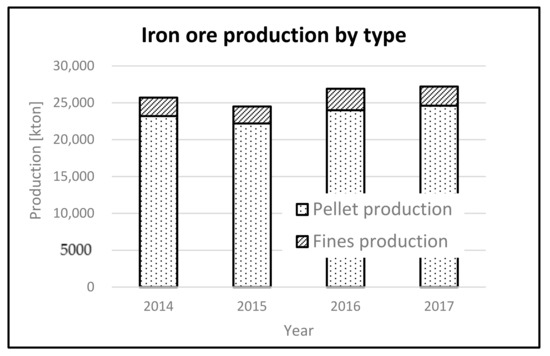 Swedish ore is produced by Luossavaara-Kiirunavaara Aktiebolag (LKAB) as pellets and fines. Pellets are the main product produced by LKAB by quantity (around 80–90% of the products are pellets). There is some flexibility in the production process, so that the ratio between pellets and fines production can adapt to the current demand. However, only a fraction of the raw ore has properties making it possible to turn into sinter fines, while the requirements for pellets production is less strict [73]. Figure 6 presents the production by type of products between the years 2014–2017. Due to their high iron content and a size interval of 0–2 mm, hematite and magnetite fines are of interest to use in OCAC. Iron ore from LKAB has not been a subject for OCAC or CLC experiments, but other samples of iron ores have shown good bed material properties in CLC experiments. Crushed iron ore has been used in experiments using coal and wood char as fuel (e.g., [74,75]). However, due to the high purity, the MAF-product produced by LKAB more closely resembles iron mill scales in composition [65].
