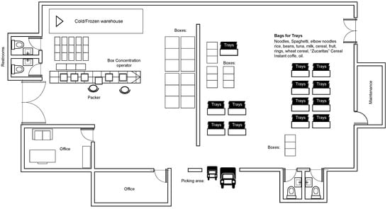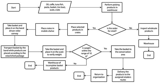 The organization where this study is performed is from the business subsector located in the tertiary sector because buying–selling activities are performed for greater or lesser products of the basic food basket, specifically shelf products (dry) such as oil, instant coffee, tuna fish, wheat cereal, rice, beans, and pasta (macaroni, spaghetti, and noodles). The focus of the study is in the area of product packaging (production) given that the activity of placing individual products is in containers that group together merchandise in a package. The trajectory of these articles performed by the enterprise is as follows: they go into pallets in packages for wholesale or retail (depending on the type of demand) and are taken to a warehouse. Figure 1 represents the process to obtain the packages of the basic food basket.