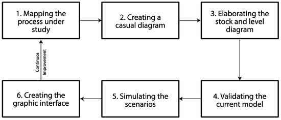 The method was followed in six steps according to Lagarda-Leyva [11]: (1) Mapping the process being studied by means of a value stream map (VSM); (2) Creating a causal diagram; (3) Elaborating the stock and levels diagram, as well as the equations; (4) Validating the current model; (5) Simulating scenarios; (6) Creating the graphic interface. See Figure 2.
