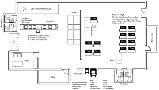 The packaging process of the basic basket dry products was characterized. Figure 3 exemplifies the production area beside the warehouse and conservation areas that participate in the process. It also shows data related to the current capacity of the band, which at the moment of the study was 250 packages/day. However, only an average of 25 packages/week is demanded, which is operated by only one employee, who works eight h/day, with a production capacity of one package in 93.7 s.
