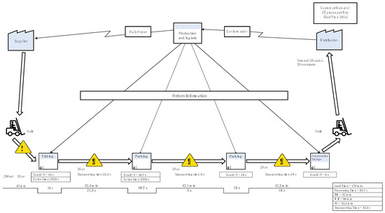 Under the current production conditions, equipment utilization and operator efficiency were 1.38% and 1.66%, respectively, making the existing breach in the organization evident. On the other hand, information and material flow (Figure 4) shows the existing relationship among the different links of the supply chain.
