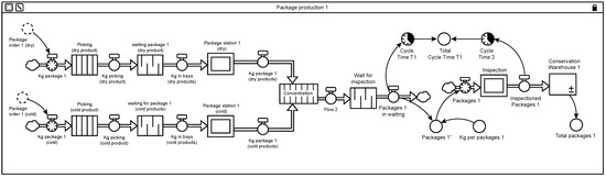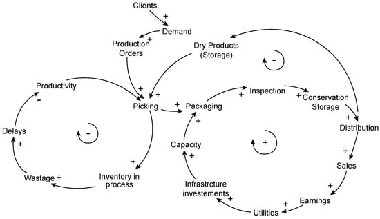 Figure 5 shows the run the products performed to make the package go from the dry product warehouse to distribution passing by picking, packaging, and inspecting stages. The variables and their interaction with one another are represented in the diagram, which shows that to start the process, a variable called “production order” is necessary, but it is only launched when a client demand exists. Furthermore, loops created according to the variable relationship are also shown in Figure 5. The most representative for the process, in itself, starts with the existence of dry products, which indicate more picking, representing, at the same time, more packaging, followed by more inspection, more packages in the conservation warehouse, and more distribution. All these variables result in having fewer products in the warehouse, thus, closing a balance loop. The positive symbol (+) refers to cause-effect booster type relationships between one variable and the other one. For example, the increase (+) in demand increases (+) production orders. On the other hand, the negative (−) sign refers to balance relationships. For example, at greater (+) delays, the lower (−) productivity. The causal diagram can be positive or negative relationships, considering all of them cause-effect given among the variables that form the loop. In this case, there are two negative loops and one positive.