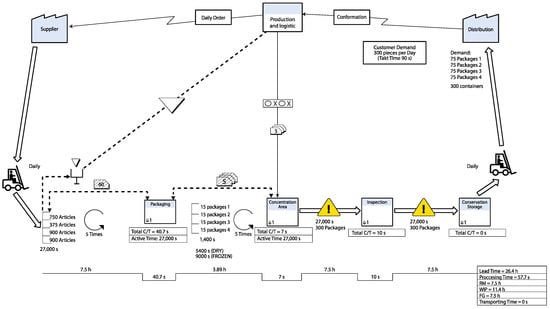Figure 4 shows that the organization works within a pull production system because the production department carries out the orders made by the clients, which sets the pace of the final production stages, eliminating the end product inventory. On the other hand, waiting time is perceived to be at 10,200 s/package, which translates to the time required by the employee to fulfill his/her workload. It also shows that processing time is 93.7 s, where 46% represents transport time, indicating that an area of opportunity exists in the redistribution of facilities. Within the timeline shown in the VSM, the activity that requires greater time is product packaging. However, under the current situation of the company, this timing is still short.