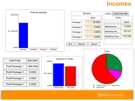 The graphical interface represents a mode of communication with the decision-maker. The purpose is to offer a better understanding of the parts interested, which is why the interface is shown in charts, tables, and buttons to facilitate the interpretation of the data obtained. The image in Figure 10 shows the general utility by selling all the packages demanded, where all the costs associated with production intervene in the income generated.
