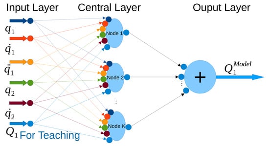 - These neurons were arranged in a single layer in which each neuron obtained its input value for the “teaching process” as for the free system, and for the dynamic model. If the input signal belonged to the “range of competence” of the given neuron, , , and were computed. During the “normal operation” the neuron used the input for the free system modeling as and for “the use for control mode”. If the input data belonged to its range of competence, it computed , computed the rotated vector for the free system, and for the control application, and as its output, it provided the first component of the rotated vector that corresponded to the modeled value of and Q, respectively.