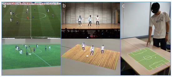 Because the MonoMR system can easily synthesize the MR content from a single monocular camera, the user can create sports content from 2D videos, view the content with a free-viewpoint, and recognize the 3D positions of players intuitively (Figure 15a). In addition, given that the system can generate a single scene from multiple monocular videos, capturing a large stadium, which is difficult to capture using a single camera, is possible by dividing the capture area into multiple cameras and merging the videos into a single content.