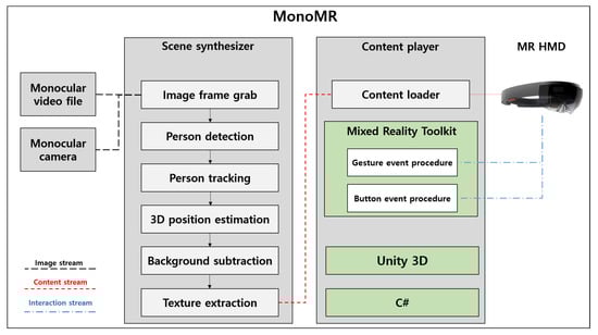 As shown in Figure 2, the MonoMR system consists of a personal computer-based scene synthesizer to synthesize content and a HoloLens-based client player to play the content. This section describes how the scene synthesizer generates MR content from monocular videos, and the client player displays the generated scene.