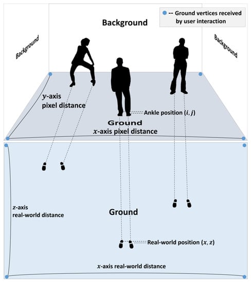 In order to capture the depth information of humans in the real world, multi-view stereo vision, depth cameras, and DNNs have been used in existing systems. However, these systems require a complicated configuration or special equipment and are difficult to use. In this study, we propose a simple depth estimation method using the homography matrix [], calculated based on the detected person’s ankle position and minimal user interaction, as illustrated in Figure 3. The system receives the four vertices and approximate distance of the real world between the vertices in the first frame of a video from users. Then, a homography matrix H for mapping the image coordinate system into the real-world coordinate system is calculated. Then, the pseudo-3D position on the real world is calculated using the following equation.