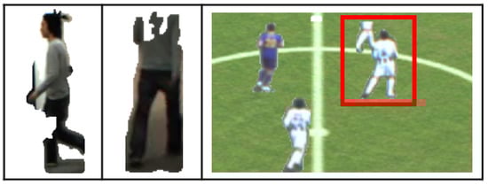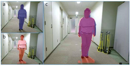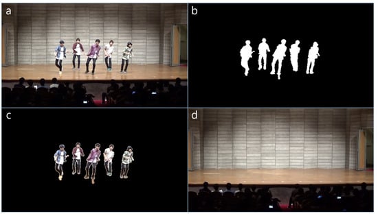 Because deep learning technology has been rapidly developed recently, human analysis problems, which are difficult to solve using conventional image processing algorithms, have been addressed. Person detection [,] and pose estimation [,] provide an important basis in recording free-viewpoint videos from monocular videos. Semantic segmentation that utilizes deep learning, such as mask R-CNN [], estimates not only the person’s pose but also the segmentation mask at the pixel level. However, it requires a very time-consuming calculation.