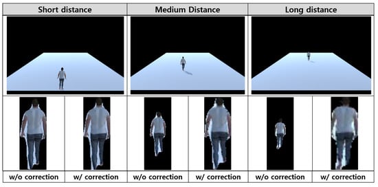 If the extracted texture is directly applied to the scene, then the size of the same person is different according to the position of the perspective. To minimize this perspective distortion, we use a weak-perspective projection-based correction method. First, the pixel per meter in the real world at the corresponding position of the person is calculated from the homography matrix H and the position of the image coordinate system . Then, the texture size is recalculated, and the distortion is corrected as shown in Figure 5.