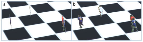 In order to address this problem, the system has a function that applies billboard rendering [] to every texture, as shown in Figure 6b. Billboard rendering is a simple technique in which the textures are rotated toward the user’s viewpoint, thereby reducing the unnaturalness of placing 2D textures in a 3D space. With this function, even if the user changes their viewpoint from the original camera’s viewpoint, they notice less unnaturalness.
